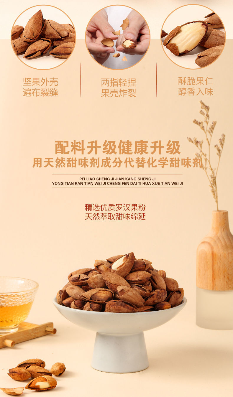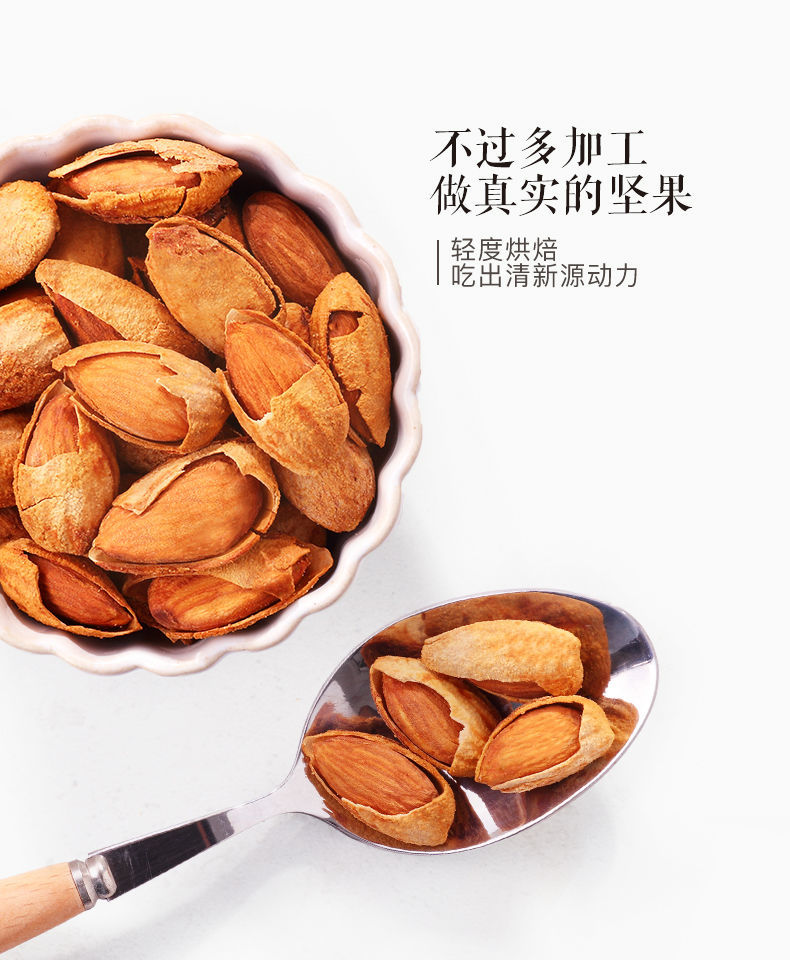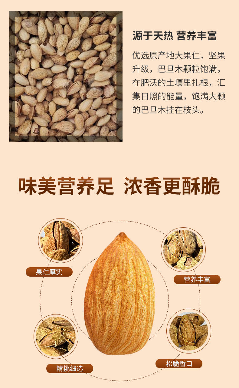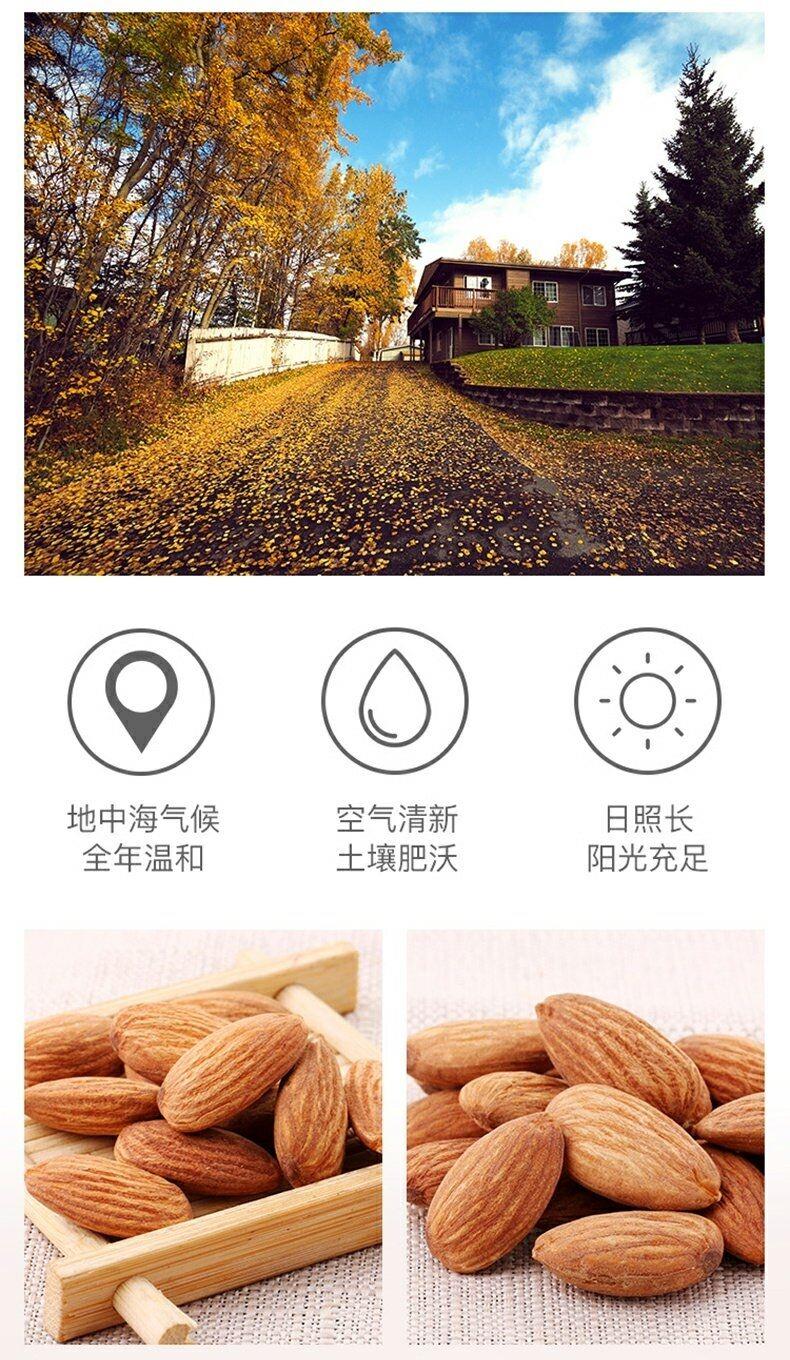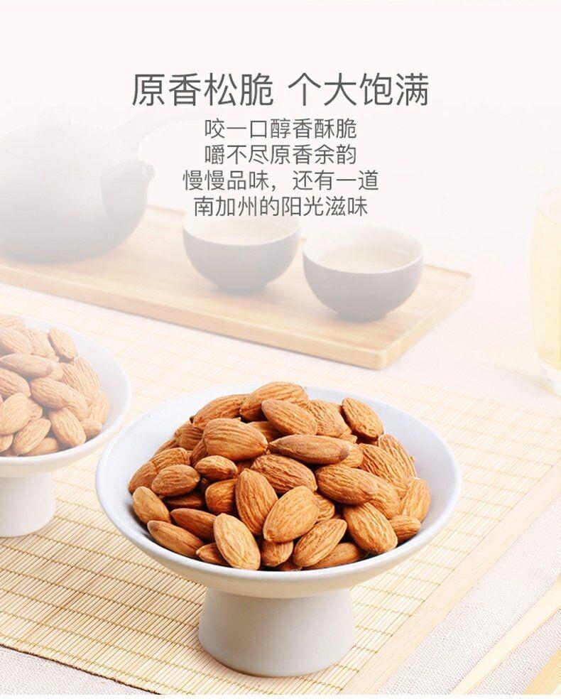 饱满香脆巴旦木,无壳免剥更·滋味,饱满果仁,咬出香脆四溢,让你享受更轻松的酥脆,来自美国加州,阳光强烈雨水温柔,在这里长大的巴旦木和爱情一样幸福,你值得拥有