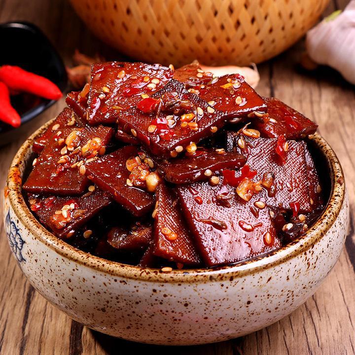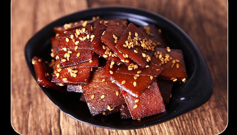 平江酱干是一道美味可口的传统小吃,属于湘菜系。起源于湘鄂赣边塞重镇岳阳市平江县长寿街,又名长寿酱干,是清咸丰年间百岁老人何维丰首创。采用长寿街传统卤制与烘烤食品工艺相结合手法,烧制出具有方寸大小、铜钱厚薄、乌黑油亮、芳香四溢的豆腐干,取名“多珍酱干”。每十片用棉线一匝,谓之一筒。味道醇美,耐嚼爽口,到民国年间,长寿酱干已是香遍湘鄂赣边区,成了平江的一大特产。