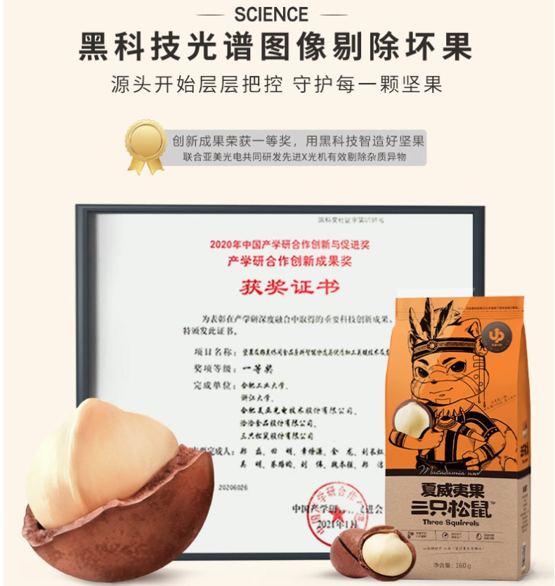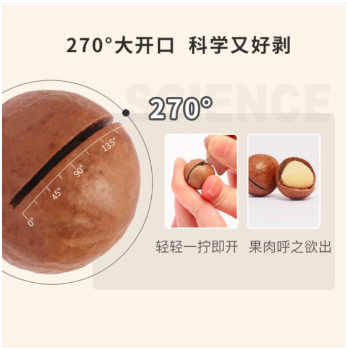 三只松鼠夏威夷果,采摘干制,实时生产、出厂,双层包装脱氧保鲜,保证了干果口感与品质。