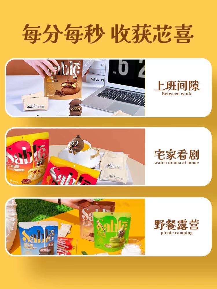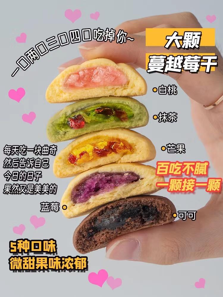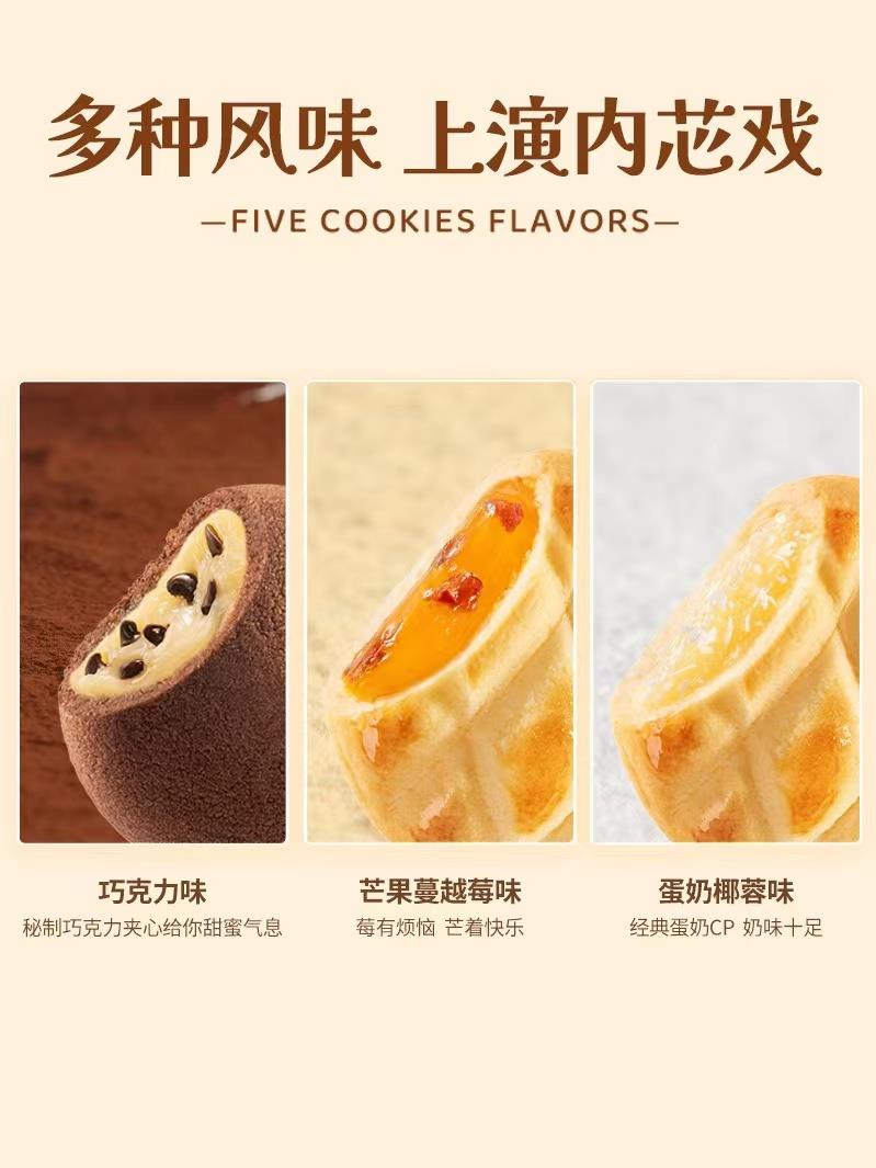 三重夹心曲奇饼干上演诱人的“内芯戏”,表面含巧克力豆,多种口味可选,甜度适中。