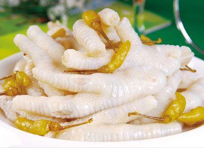 泡椒凤爪,属川菜中的小吃之一,是起源于成都名厨兰桂均的独特美食。其以酸辣爽口、皮韧肉香而著称。泡椒凤爪既能登大雅之堂,也为普通老百姓所喜爱。此款美食具有开胃生津、促进血液循环的功效。菜品特色脆香鲜辣,开胃解腻,提神醒脑,营养丰富