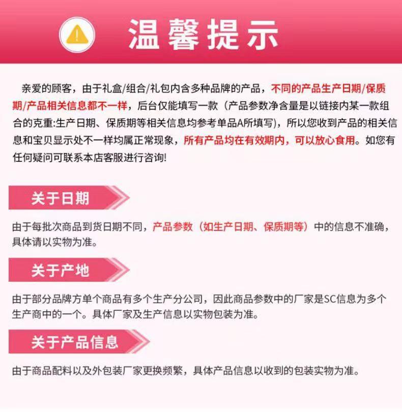 亲爱的顾客,由于礼盒/组合/礼包内含多种品牌的产品,不同的产品生产日期/保质期/产品相关信息都不一样,后台仅能填写一款(产品参数净含量是以链接内某一款组合的克重:生产日期、保质期等相关信息均参考单品A所填写),所以您收到产品的相关信息和宝贝显示处不一样均属正常现象,所有产品均在有效期内,可以放心食用。如您有任何疑问可联系本店客服进行咨询'