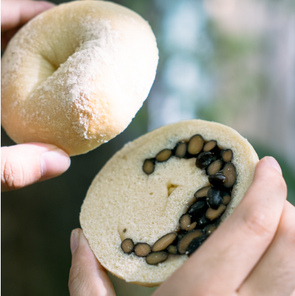 纯豆腐入胚,大米粉和糯米粉不仅增添了浓郁的米香,而且贡献了别具一格的柔韧口感。低甜度的黑豆,撒在表面的黄豆粉,都相得益彰。让这只贝果有一种,相亲相爱一家人的感觉。
