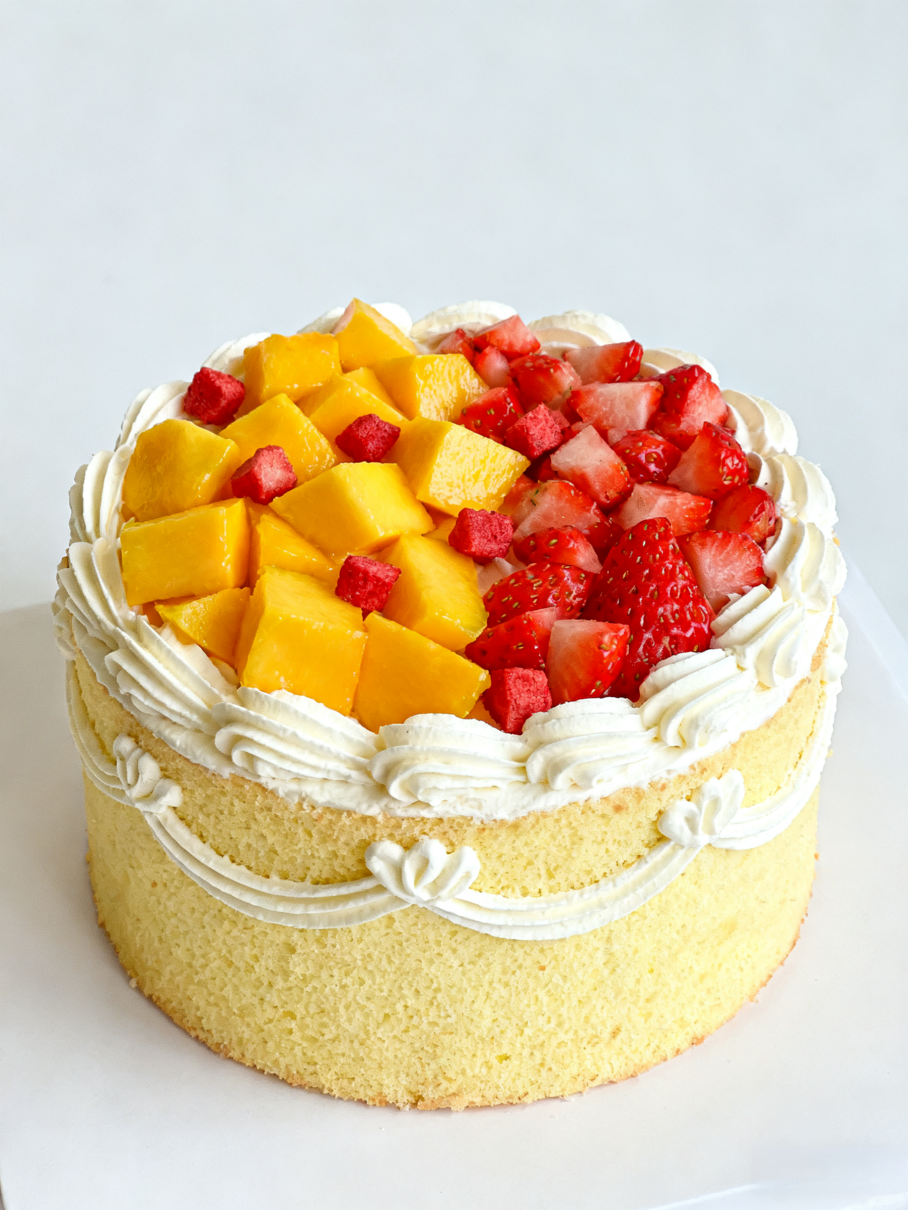 铺满新鲜现切芒果块+草莓粒,果香裹着奶香,每一口都是清甜松软!