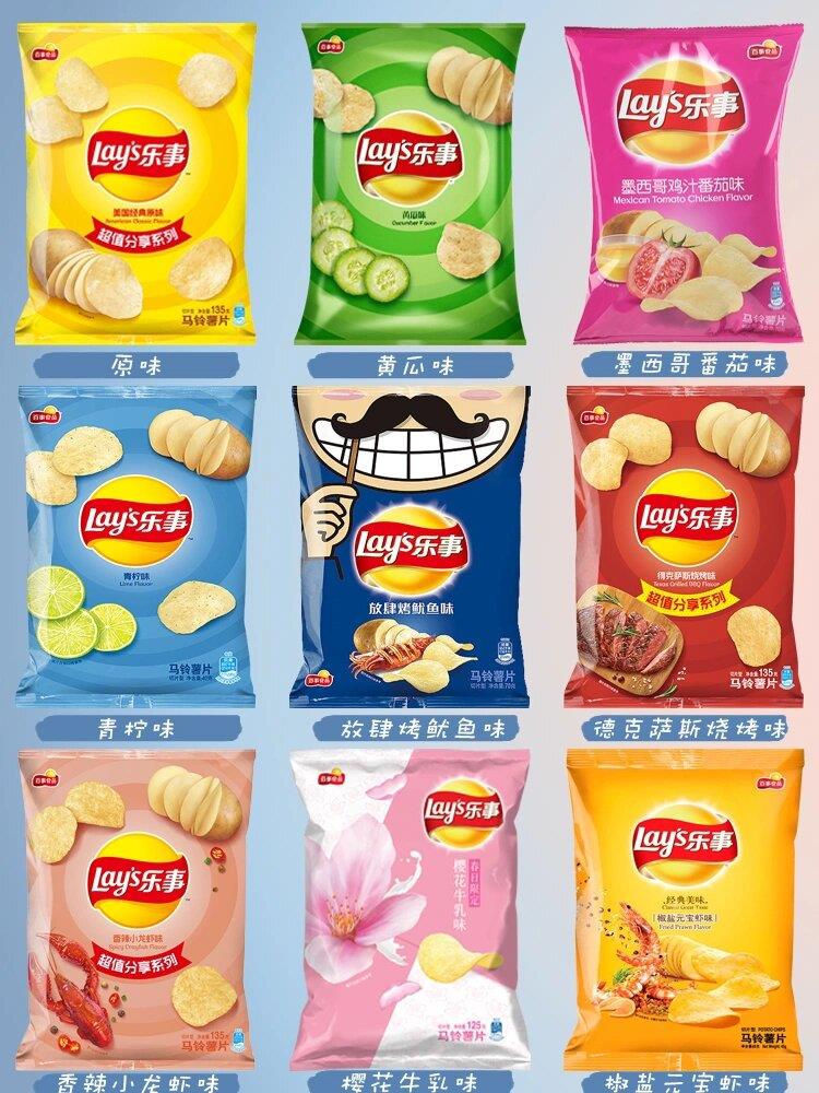 • 罐装系列:包括忠于原味、鲜浓番茄味、翡翠黄瓜味等,罐装能更好地保持薯片的酥脆度。