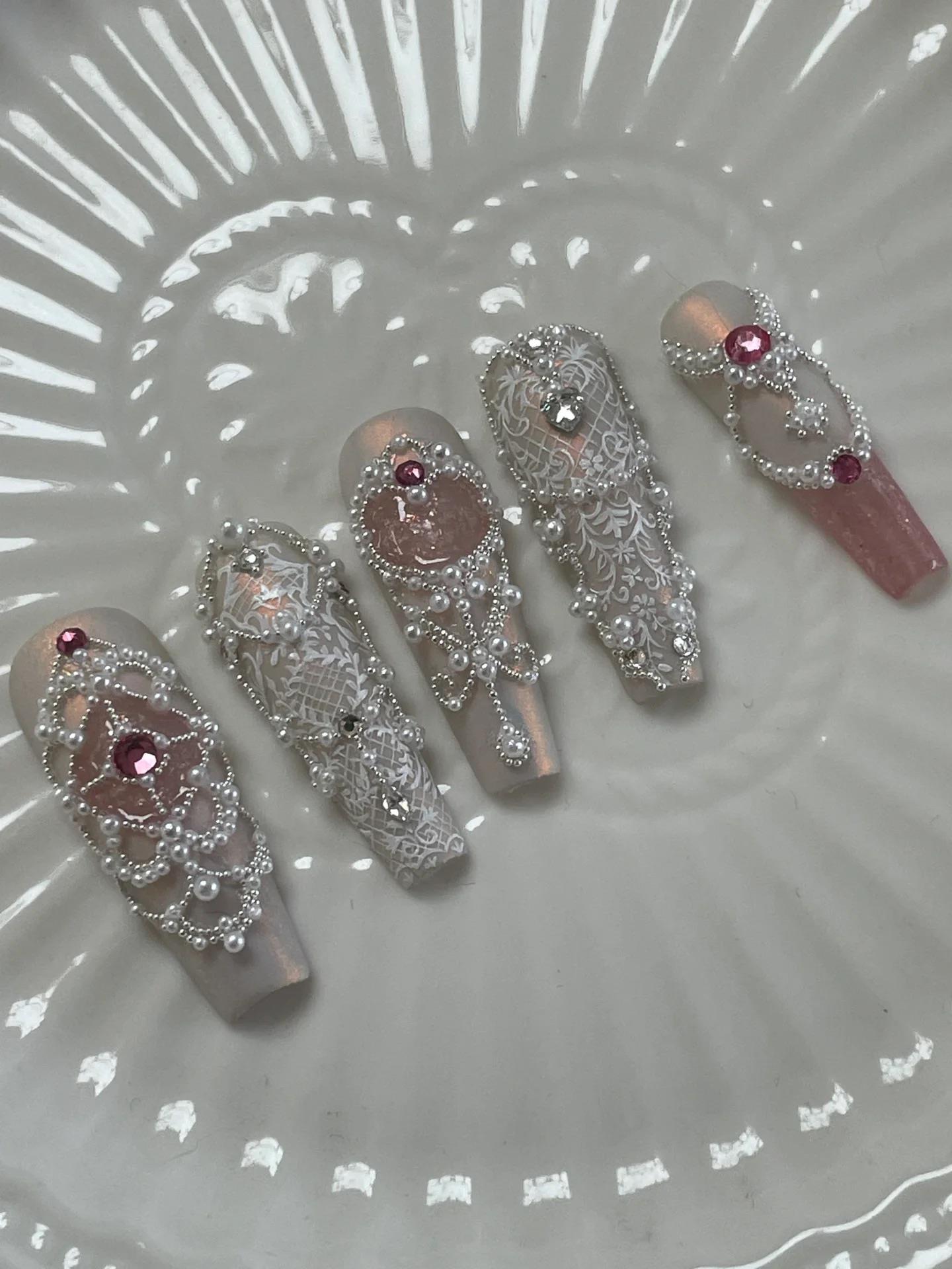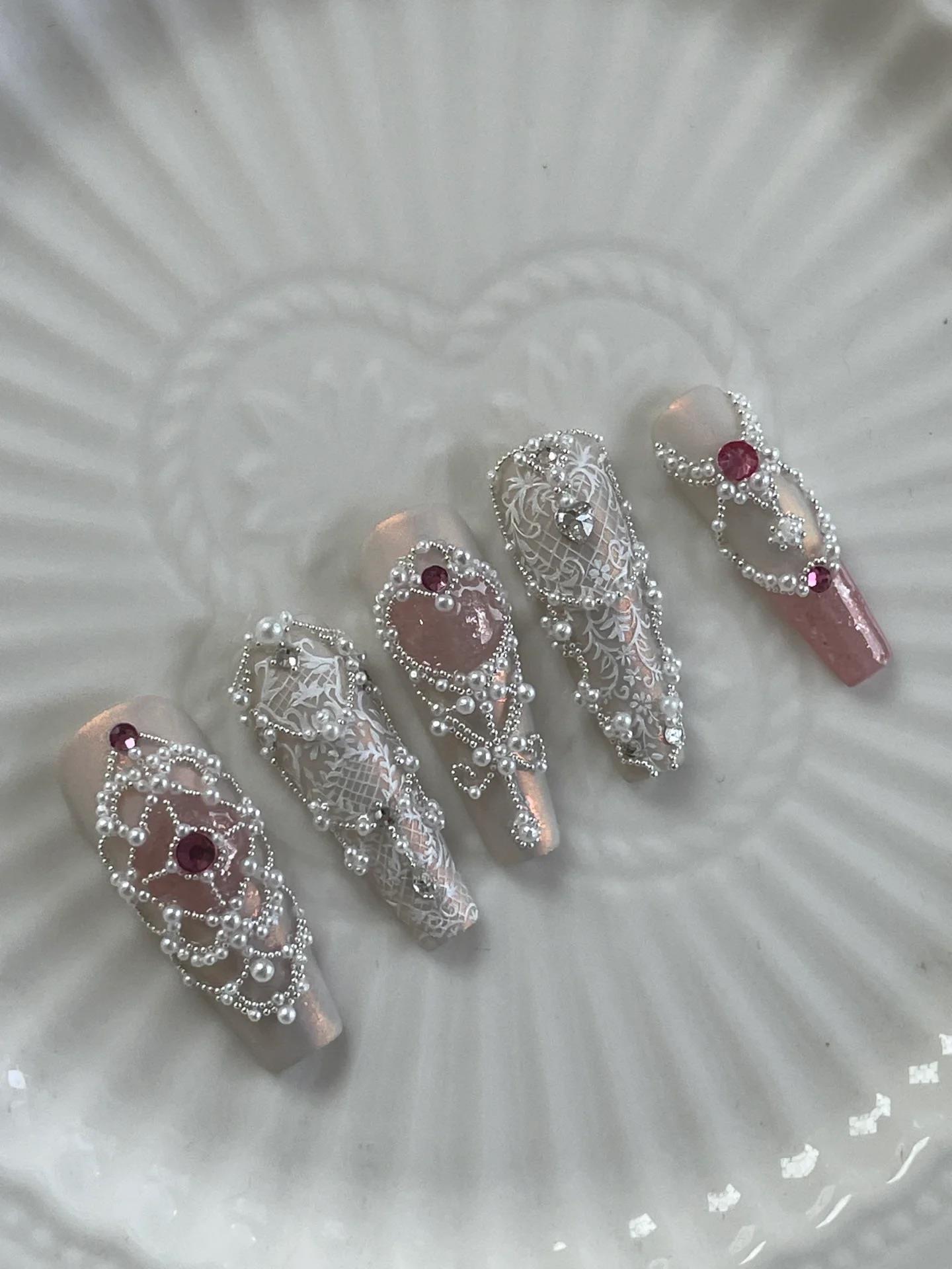超重工法式蕾丝美甲,以假日公主为灵感来源,全副采用巴洛克珍珠排列。