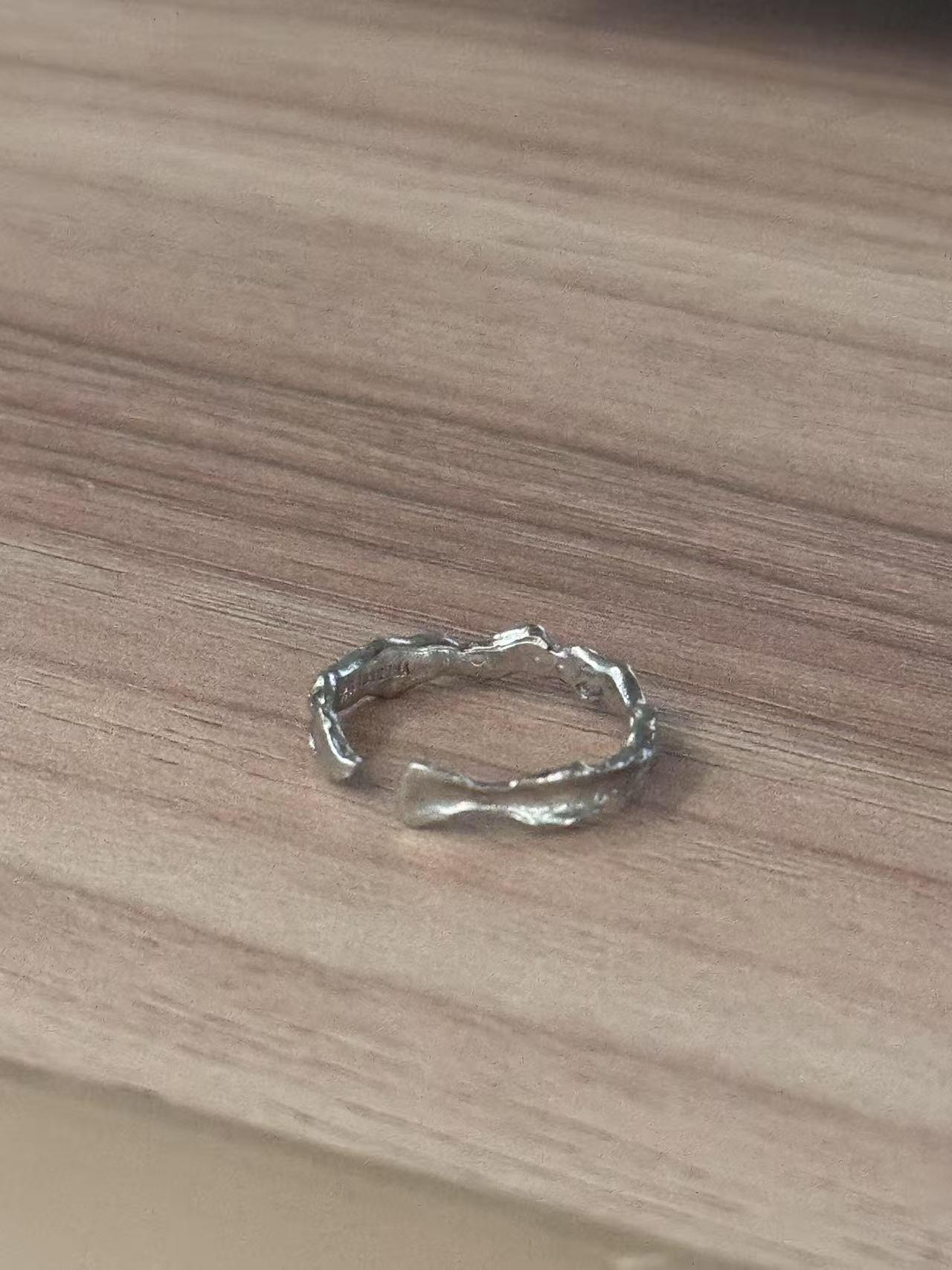 这款戒指采用纯银材质精心打造,具有抗氧化性和光泽度,长久佩戴不易褪色,能始终保持亮丽的质感。而且这种材质对皮肤友好,不易引起过敏反应。该设计最大的亮点在于破损元素与肌理感的融合,打破了传统戒指的规整形态,营造出一种不羁与叛逆的氛围,仿佛在诉说着一段独特的故事,充满艺术感和神秘感。肌理感的加入,使戒指表面更具层次感和立体感,每一处纹理都像是自然的杰作。开口设计不仅方便佩戴和摘取,还能根据手指粗细自由调节大小,适应不同人群的需求,佩戴起来更加舒适自在。这种设计既考虑了实用性,又增添了一份随性和洒脱。
