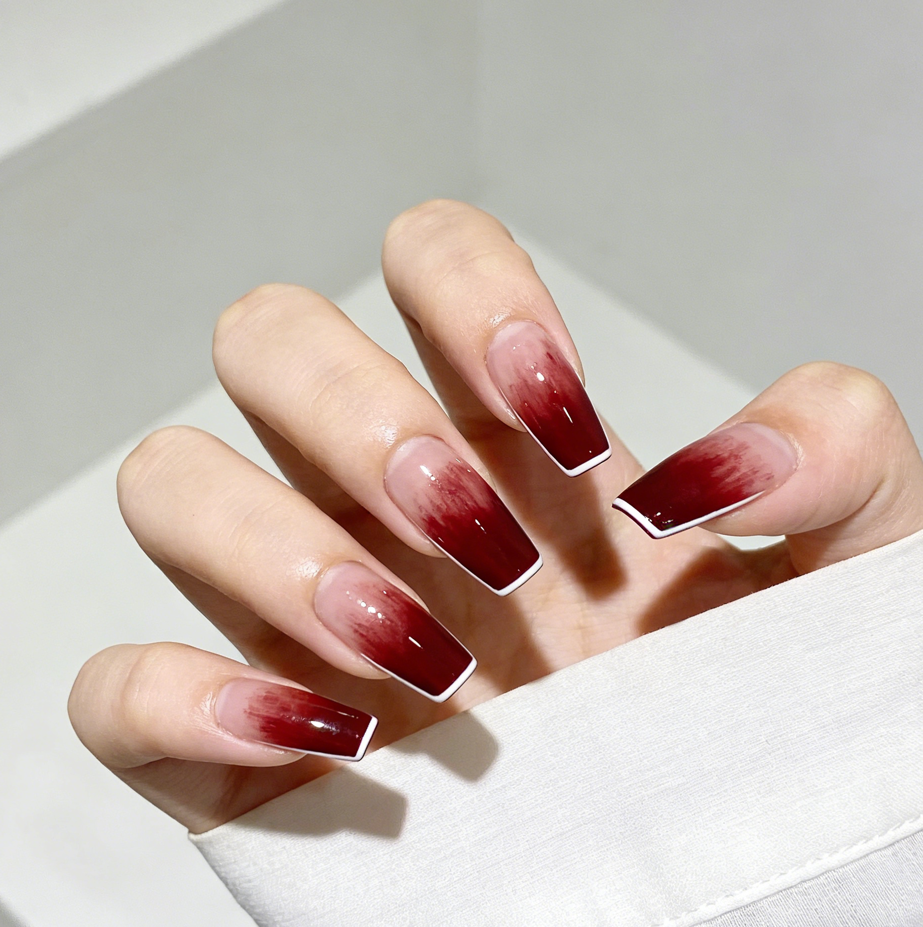 酒红晕染法式长梯款穿戴甲是一款将复古色调与现代晕染技法深度融合的穿戴艺术品。它以醇厚酒红为基调,在经典法式微笑线处进行朦胧渐变晕染,创造出如红酒滴入清水般的氤氲美感。搭配修长梯形甲型,宛如上世纪名媛指尖夹着的香烟迷雾,优雅、神秘且充满故事感,是为重要时刻与高级场合量身定制的“氛围盔甲”。