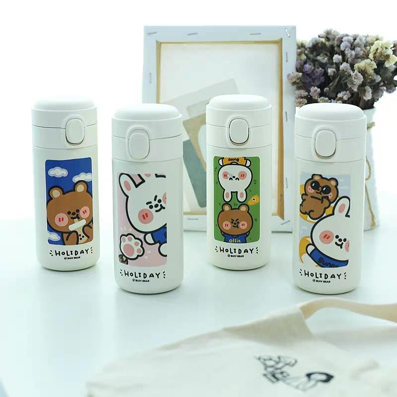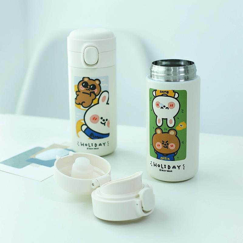 304不锈钢内胆。圆润饮用杯口,食品级PP材质,健康安全,口感舒适。可爱卡通杯身,卡通绘画风印花,不易掉色。弹盖杯盖设计,一键轻松开盖,告别拧盖烦恼