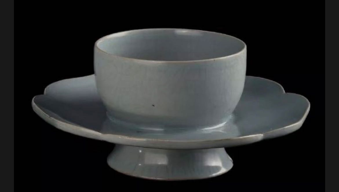 宋汝窑天青釉盏托,该瓷器盏托圆口微敛,长弧形腹,托盘边沿宽大,五瓣花朵形状,高圈足外撇,中空无底,内外施满天青色釉,釉色莹润,布满细碎开片。优美淡雅的外表,内盒装入特质的香薰,由内而外的散发恬静。