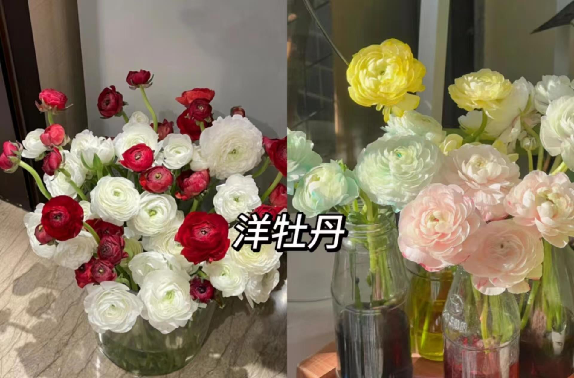 洋牡丹,学名花毛茛(Ranunculus asiaticus),是一种色彩丰富、形似牡丹的多年生草本花卉。它的花瓣层层叠叠,薄如蝉翼,花色包括白色、粉色、黄色、橙色、紫色和红色等多种选择,极具观赏价值。洋牡丹不仅花型优雅,而且花语寓意丰富,象征着“受欢迎”、“高贵典雅”和“幸福美满”,非常适合作为礼物送给亲友。