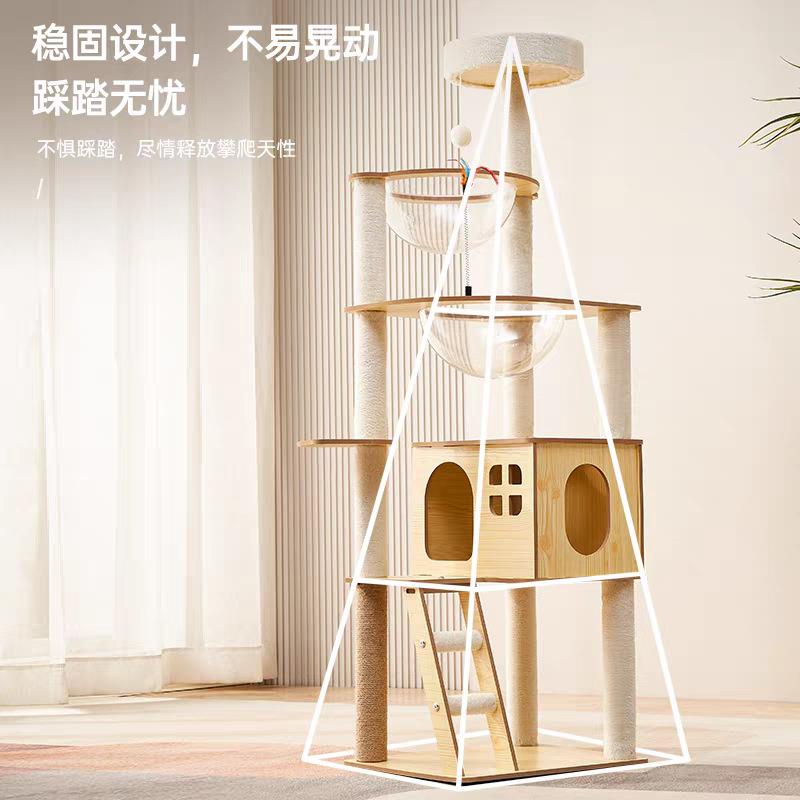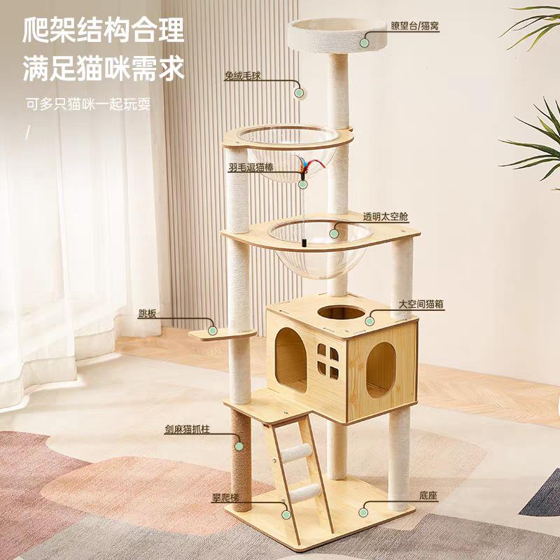 •结构设计:含剑麻磨爪柱(耐磨耐抓,保护家具)、封闭式木屋窝+半开放太空舱(适配猫咪“隐蔽安全感”天性)、多层跳台+悬挂逗猫球(满足攀爬、跳跃的运动需求);