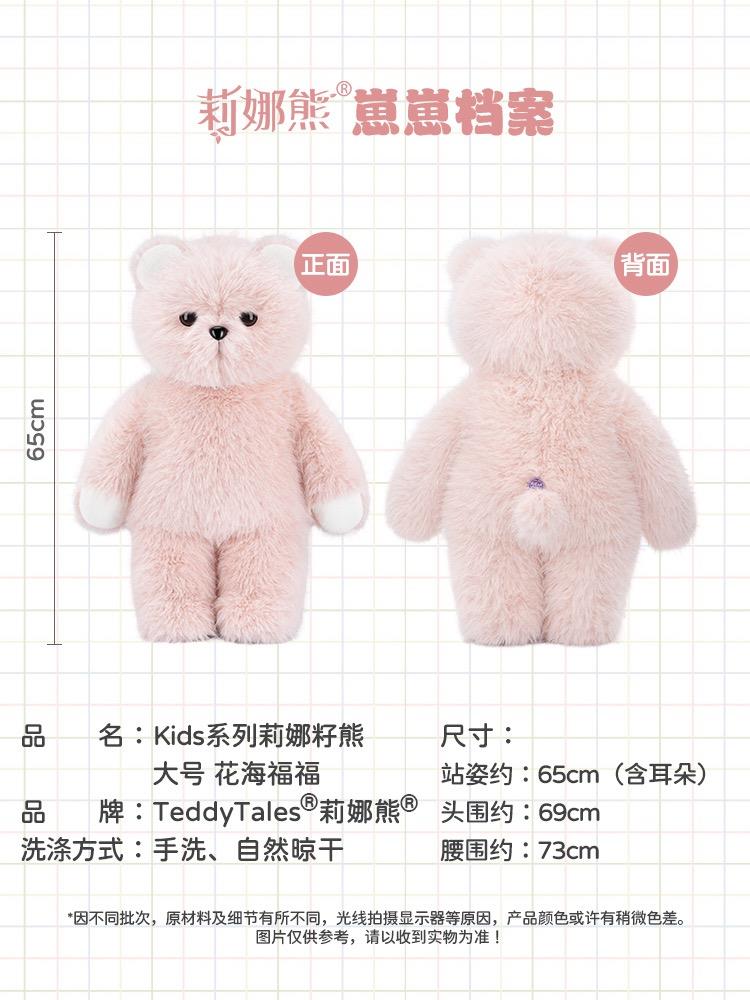 品名:莉娜熊大号-雪地福福、花海福福、雨林福福材质:聚酯纤维填充物:聚酯纤维洗涤方式:手洗,自然晒干,不可机洗托卡面料特性:光泽度好、手感细腻、韧性强、抗皱抗静电等优点细节:手工缝制背标