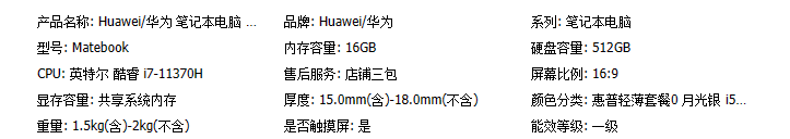 • 商品名称:Huawei华为笔记本电脑i7商...