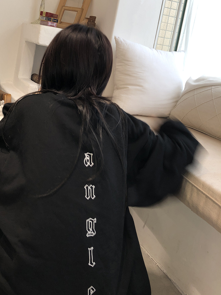 做旧印花圆领宽松中长款黑色加绒卫衣