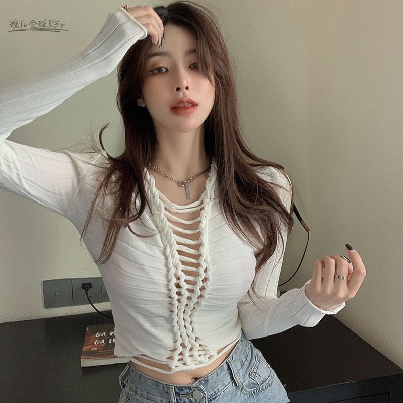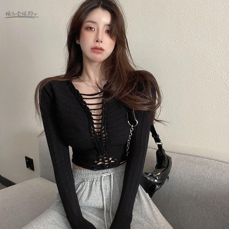 服饰箱包、运动户外 > 上装 > 日本小众纯欲风秋冬独特设计感辣妹性感镂空针织打底衫女内搭上衣