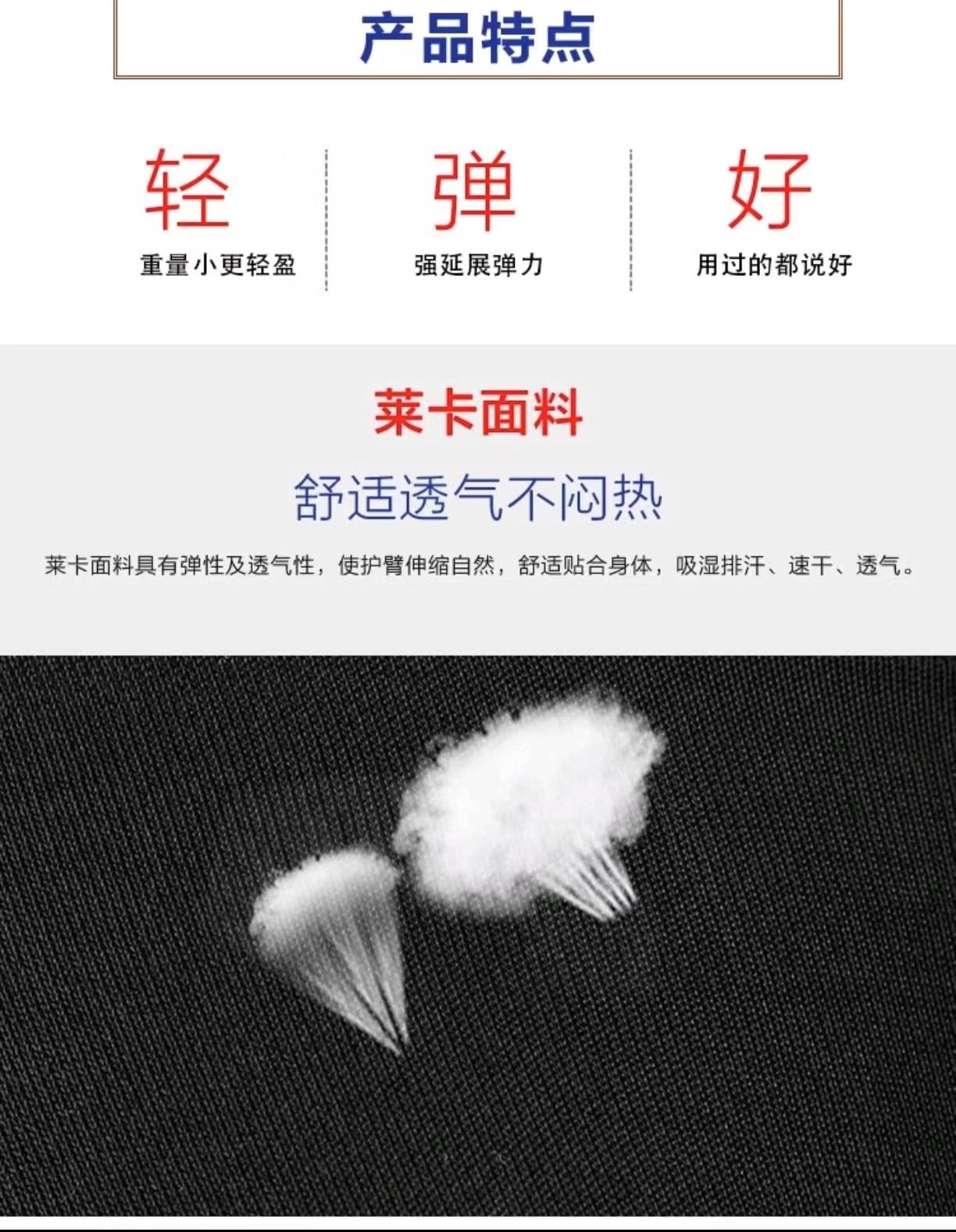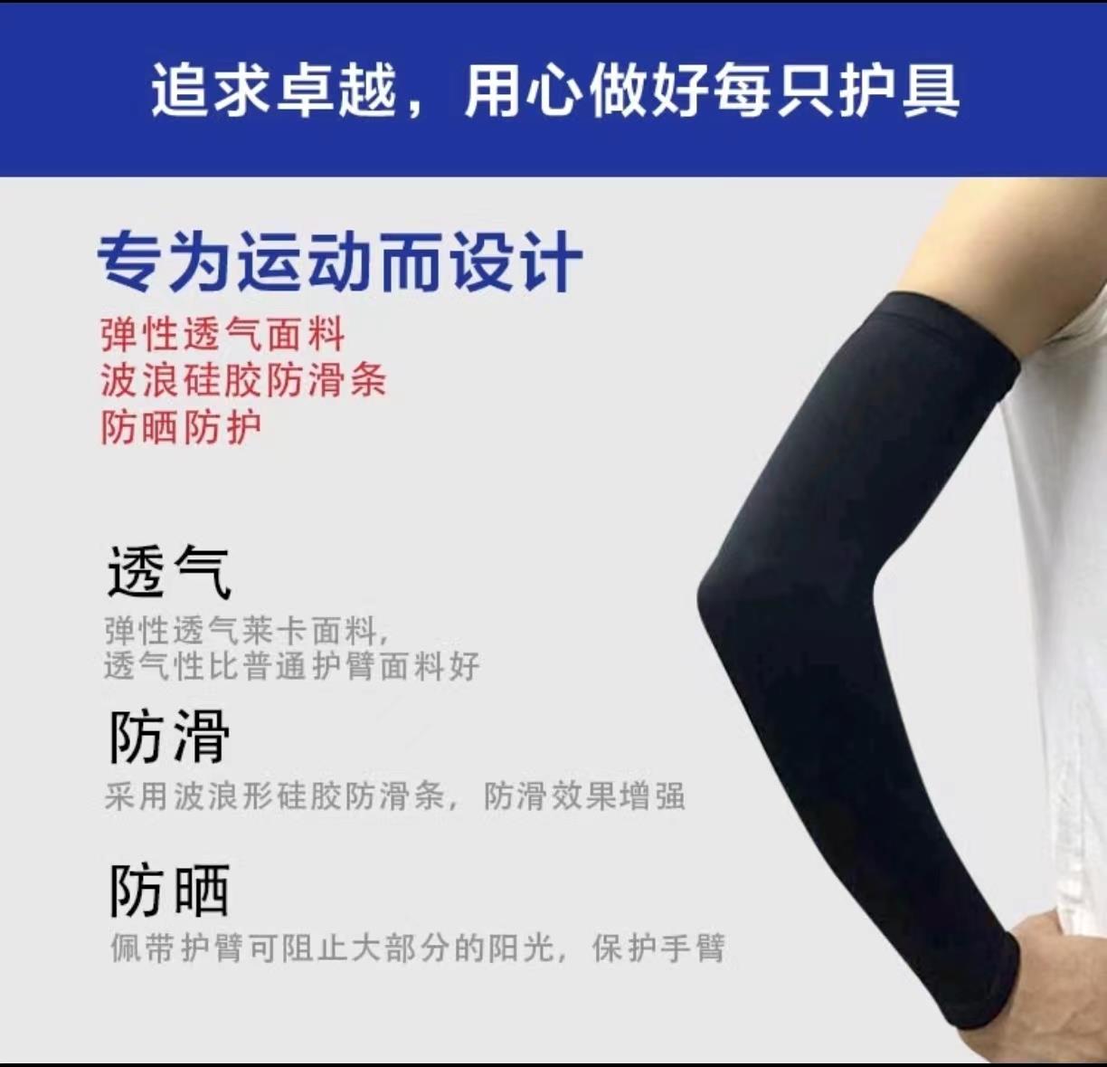 4、专为运动设计,弹性透气莱卡面料,透气性比普通护具面料好;采用波浪形硅胶防滑条,防滑效果增强;佩带护臂可阻止大部分阳光,保护手臂!