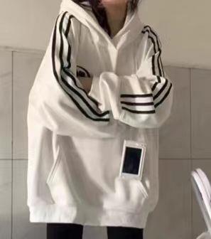 国潮拼接条纹小个子连帽白色卫衣秋冬季加绒hiphop高街情侣外套