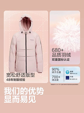 为了羽绒服整体美观度,我们会根据面料颜色的不同填充灰羽绒或自羽绒,一般深色面料填充灰羽绒,浅色面料填充白羽绒。产品面料成分及填充物请以收到的实物吊牌和水洗标为准。