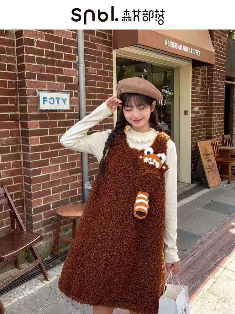 森女部落原创可爱立体熊猫背带羊羔毛连衣裙2024年新款女装秋冬款