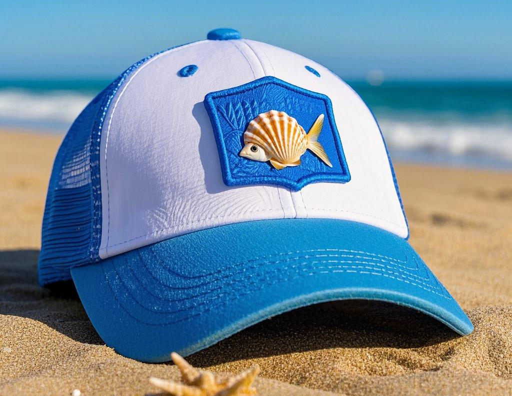 一定蓝白配色的鸭舌帽,图案是一个贝壳包着一条小鱼
