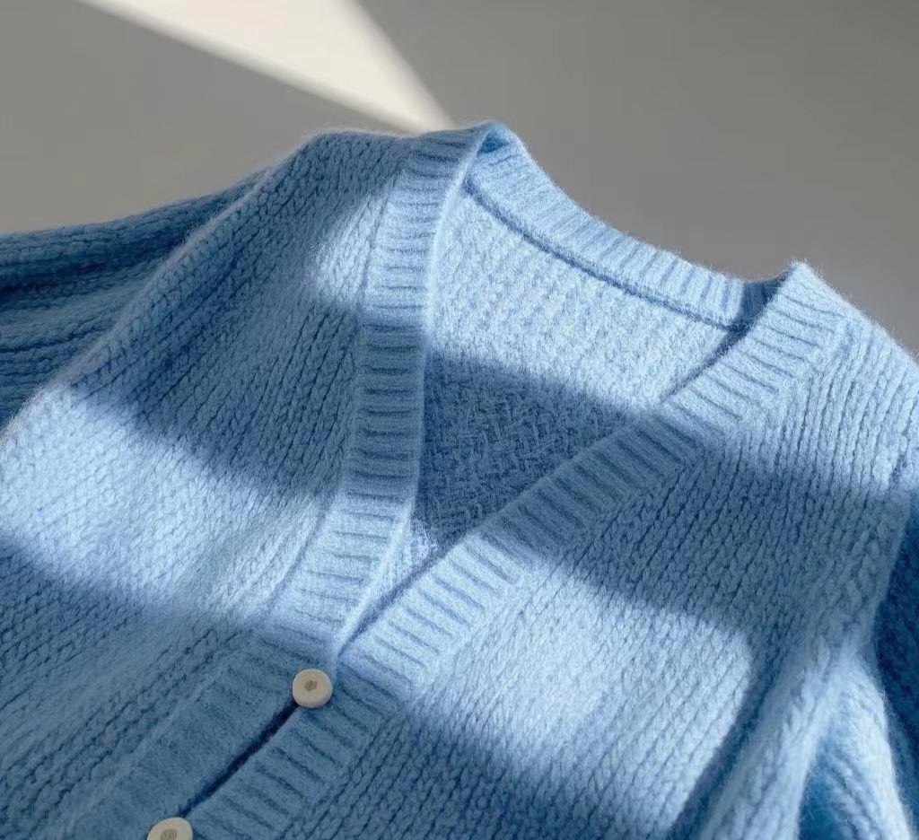 贝壳纽扣温润有质感,开合顺滑;细密的针织纹理,均匀紧致,不仅提升整体美感,更增强了衣物的耐用性。领口、袖口和下摆的卷边处理,增添了几分慵懒随性,尽显独特设计感。