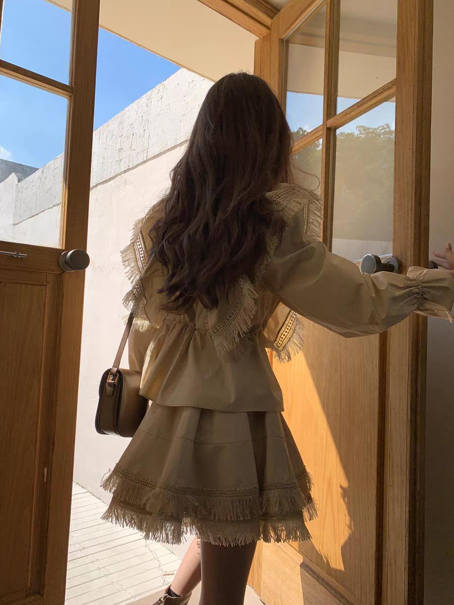 这款流苏木耳边卡其色衬衫,采用卡其色作为底色,展现出一种复古而自然的风格。领口的系带设计不仅增加了衬衫的层次感,还能根据个人喜好自由调节松紧,打造出专属的舒适度。袖口的荷叶边装饰和流苏细节,为整体设计增添了一份灵动与俏皮,仿佛将法式的浪漫与田园的自然完美融合在一起,举手投足间尽显女性的柔美与优雅。