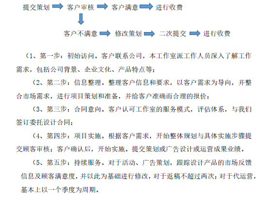提交策划,客户审核,客户满意进行收费,客户不满意,修改策划,二次提交进行收费