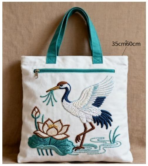 刺绣帆布包——纯棉帆布材质,原创刺绣图案(仙鹤、莲花、折扇等元素),包带可调节,内有拉链暗袋,适合日常通勤与购物。